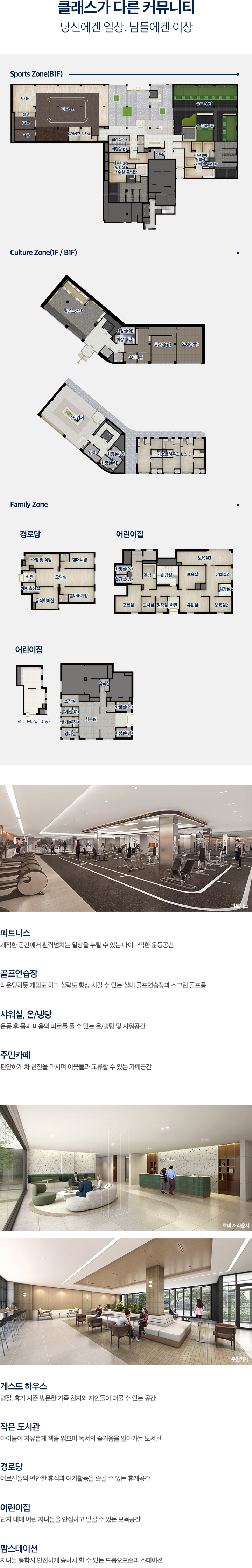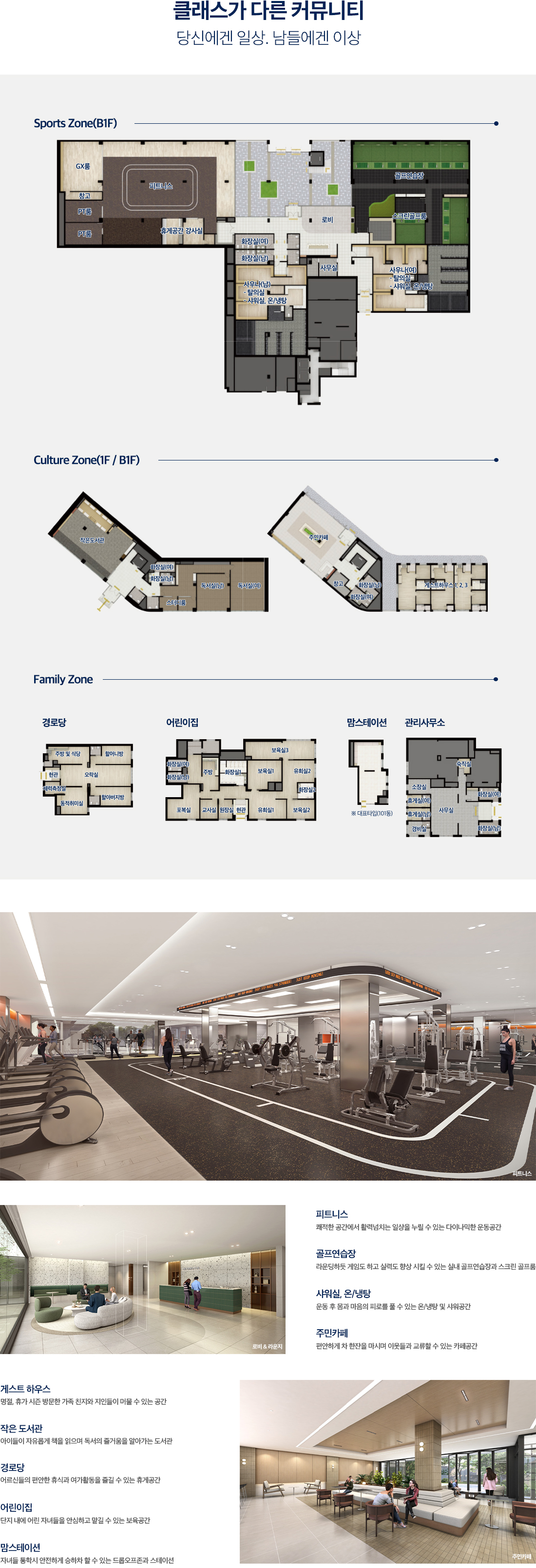커뮤니티 시설의 내부구조 및 마감재, 가구 등의 시설물에 대한 인테리어 계획은 실제와 차이가 있을 수 있으며, 홈페이지 상의 표현은 소비자의 이해를 소비자의 이해를 돕기 위해 제작된 것으로 분양대상물을 축소 표현하여 실제 크기 및 거리 등과 실제 차이가 있으며 인·허가과정에서 변경될 수 있습니다.